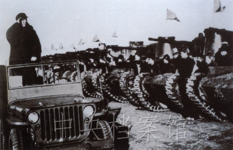 紀(jì)錄片:(群眾呼聲)中國(guó)人民萬(wàn)歲?。o(jì)錄片解說(shuō))檢閱開(kāi)始了。東北野戰(zhàn)軍參謀長(zhǎng)劉亞樓將軍,向毛主席報(bào)告受檢閱的部隊(duì)全部到齊。坦克塔上飄揚(yáng)著紅旗,坦克手精神百倍,向著自己的領(lǐng)袖敬禮。