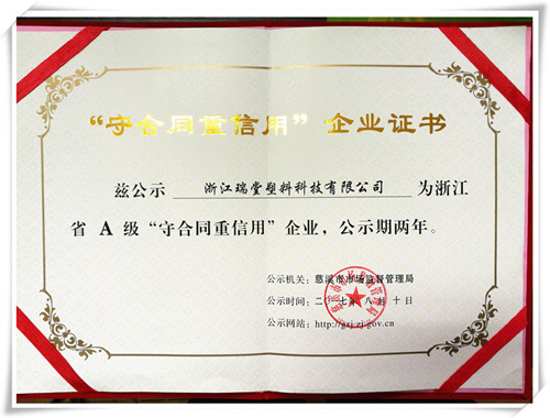 2017年8月10日,我公司獲得由慈溪市市場監(jiān)督管理局頒發(fā)的浙江省A級“守合同重信用”企業(yè)公示證書,公示期2年。