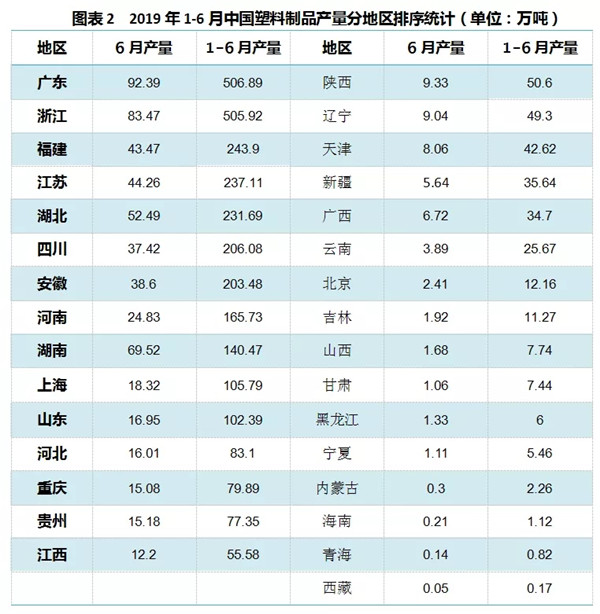 1-6月塑料制品累計產(chǎn)量排名前五位(廣東、浙江、福建、江蘇和湖北)的總產(chǎn)量達到1725.51萬噸,占到全國總產(chǎn)量53.3%。(按6月規(guī)模企業(yè)統(tǒng)計)